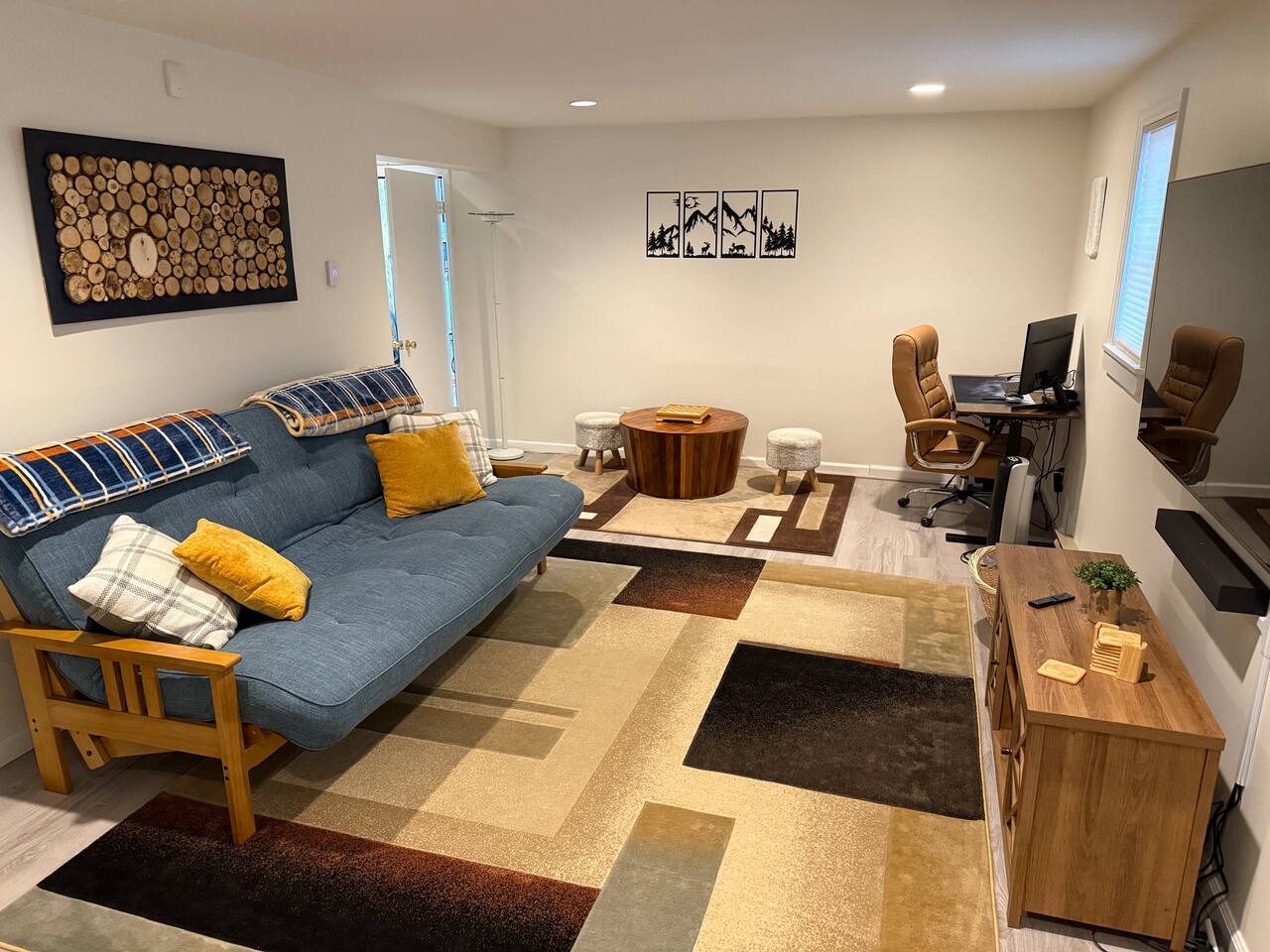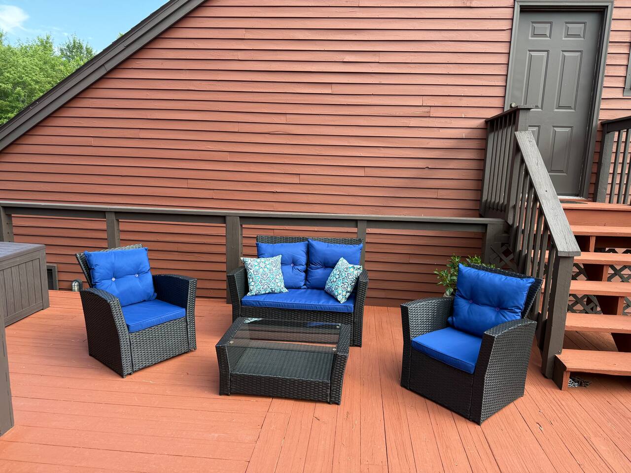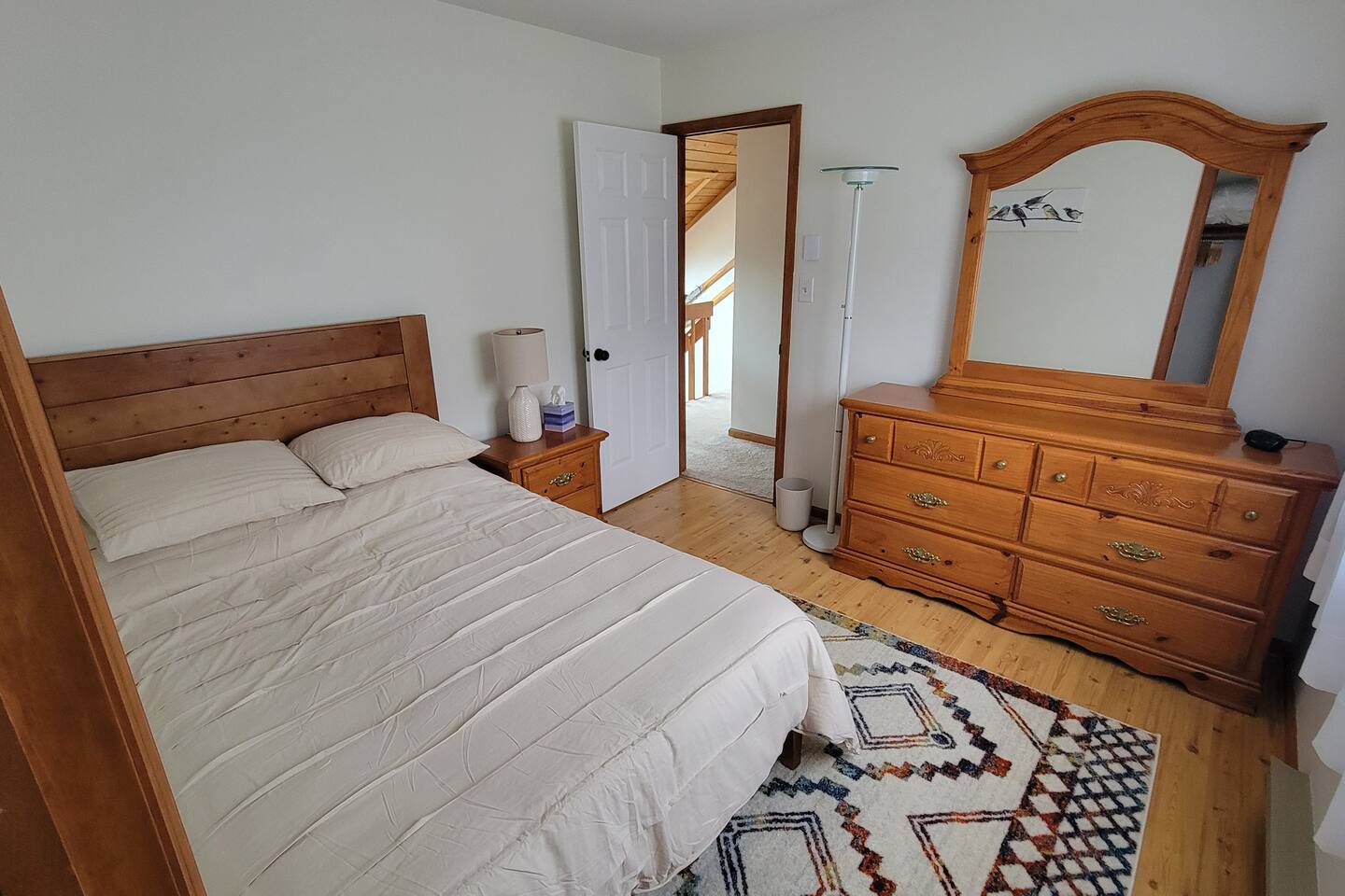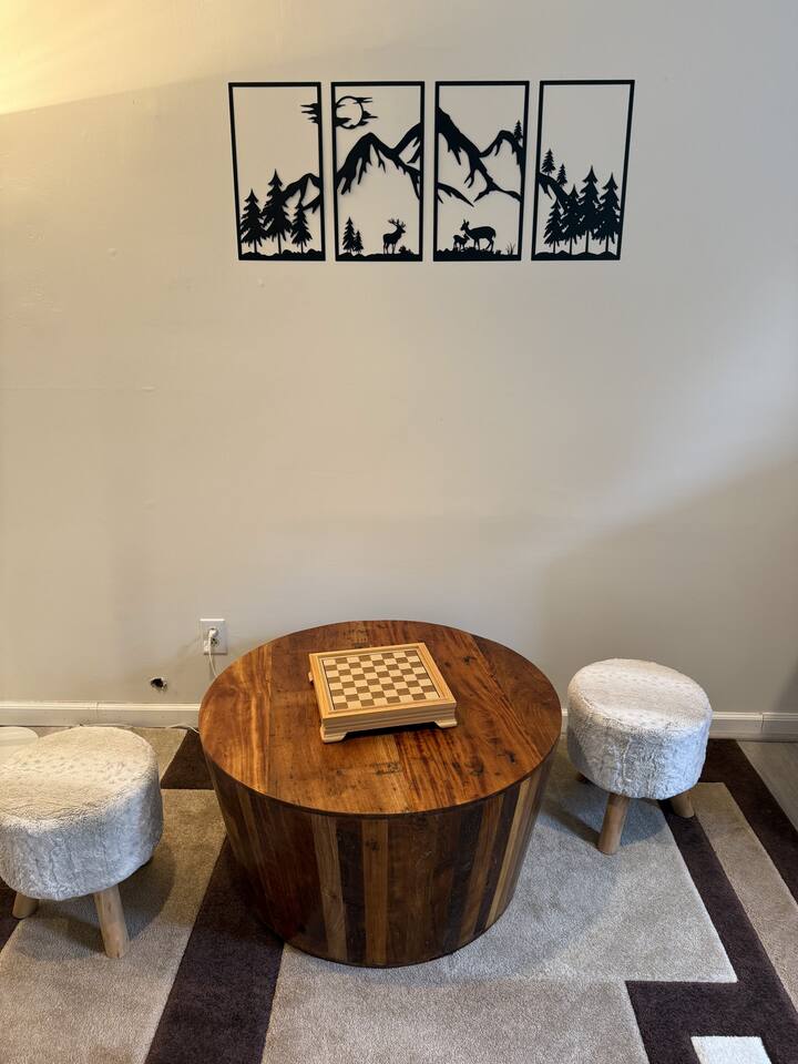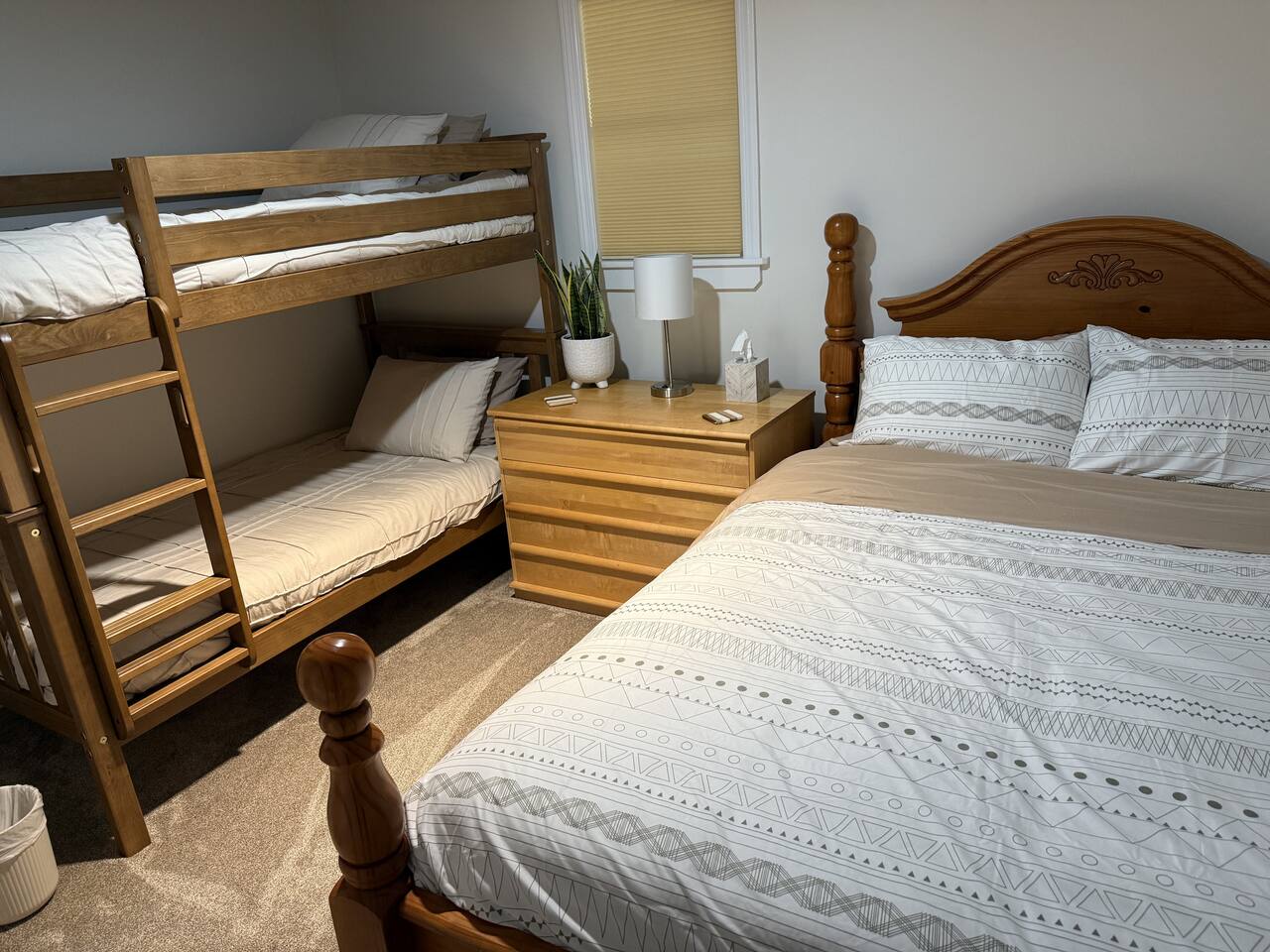 Recently renovated, we kept most of the decorative theme intact for the country home it is. It has some odd features, but we enjoyed it. The main floor is a nice-sized open space with a small full bathroom and an 8-place dining room that looks into the living room and kitchen. The living room seats 6 comfortably, and the Kitchen seats 4 at the counter. Ground Floor includes a common area with a TV, a futon that opens into a queen-sized bed, a work area with a stand-up desk, a secondary monitor, and a laptop stand. I work from home during the week when I'm in. The bedroom has a queen-sized bed and a twin bunk. A full-sized bathroom with a tub that is turned off at the moment. Also, there is a foyer with an entrance that is being renovated. This room had a garage door entrance, so we will be making this a full foyer with storage and a changing bench for the mud room. Stay tuned The second floor includes a Master Bedroom with a king-size bed, nightstands, a double-sized closet, and a private Balcony. For the romantics, it's perfect for morning coffee. The Guest room features a full size bed, dresser, and wardrobe. It's a basic but very clean room. Second floor also includes a shared full-sized bathroom and sauna. Please refrain from using the sauna while we complete an Owner's Closer separate from the upstairs. We will keep our supplies and some personal effects here for now. This is not part of the listing but will be soon.