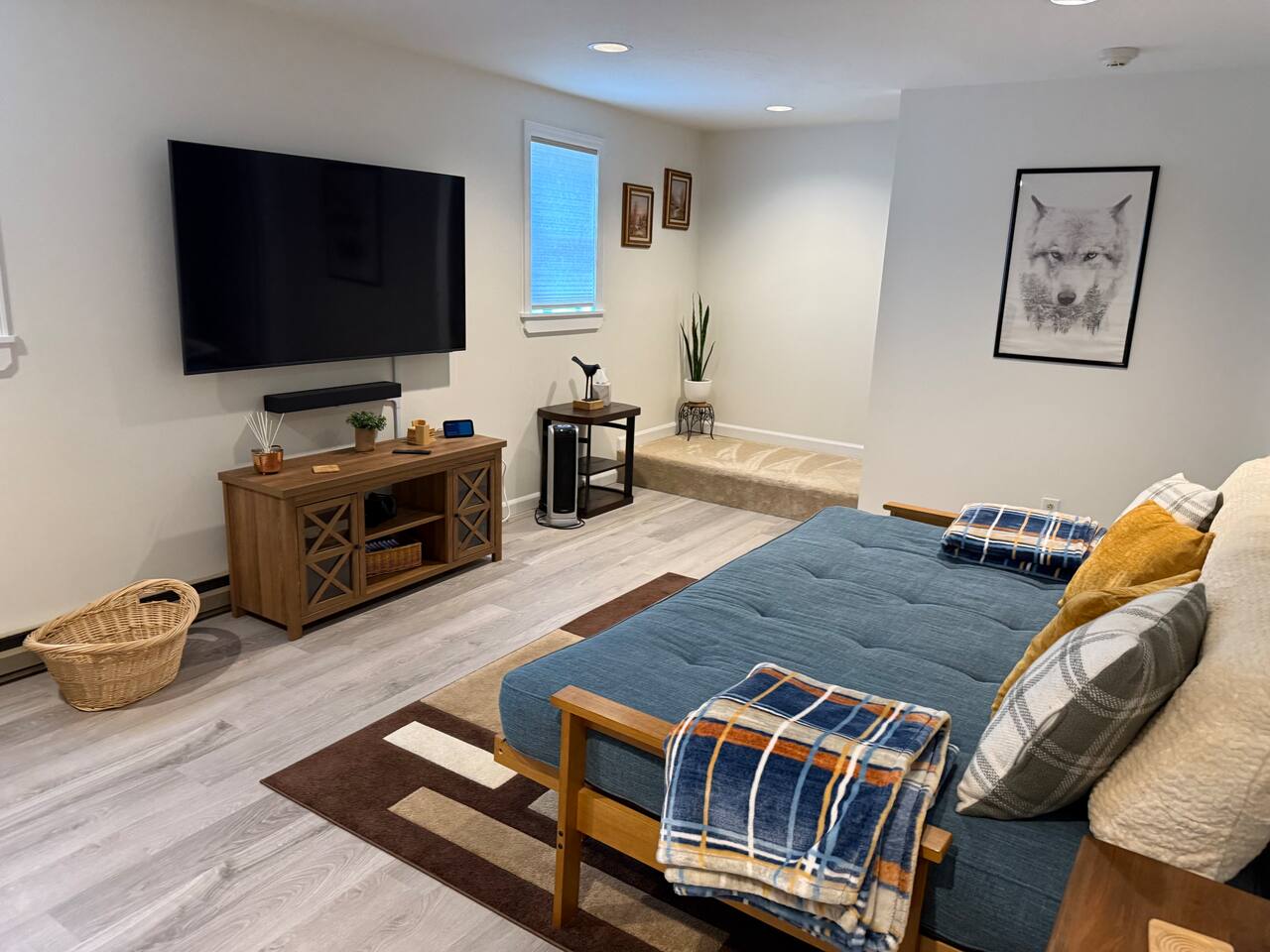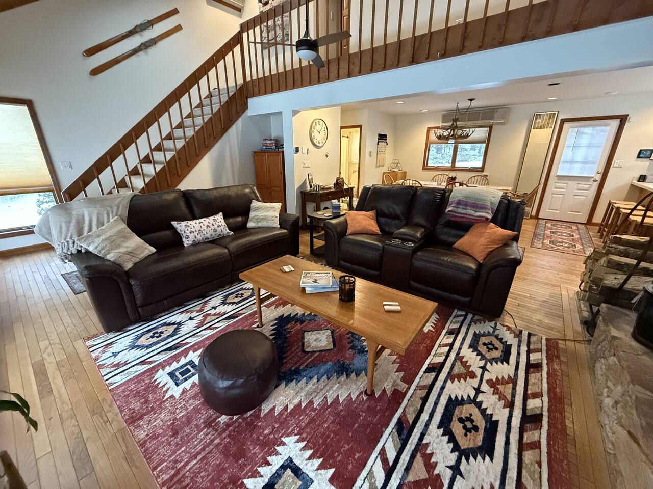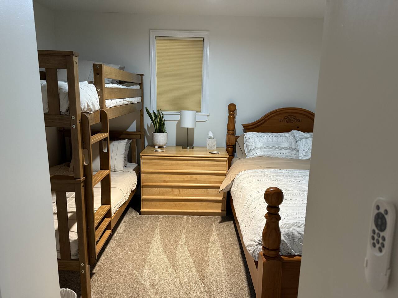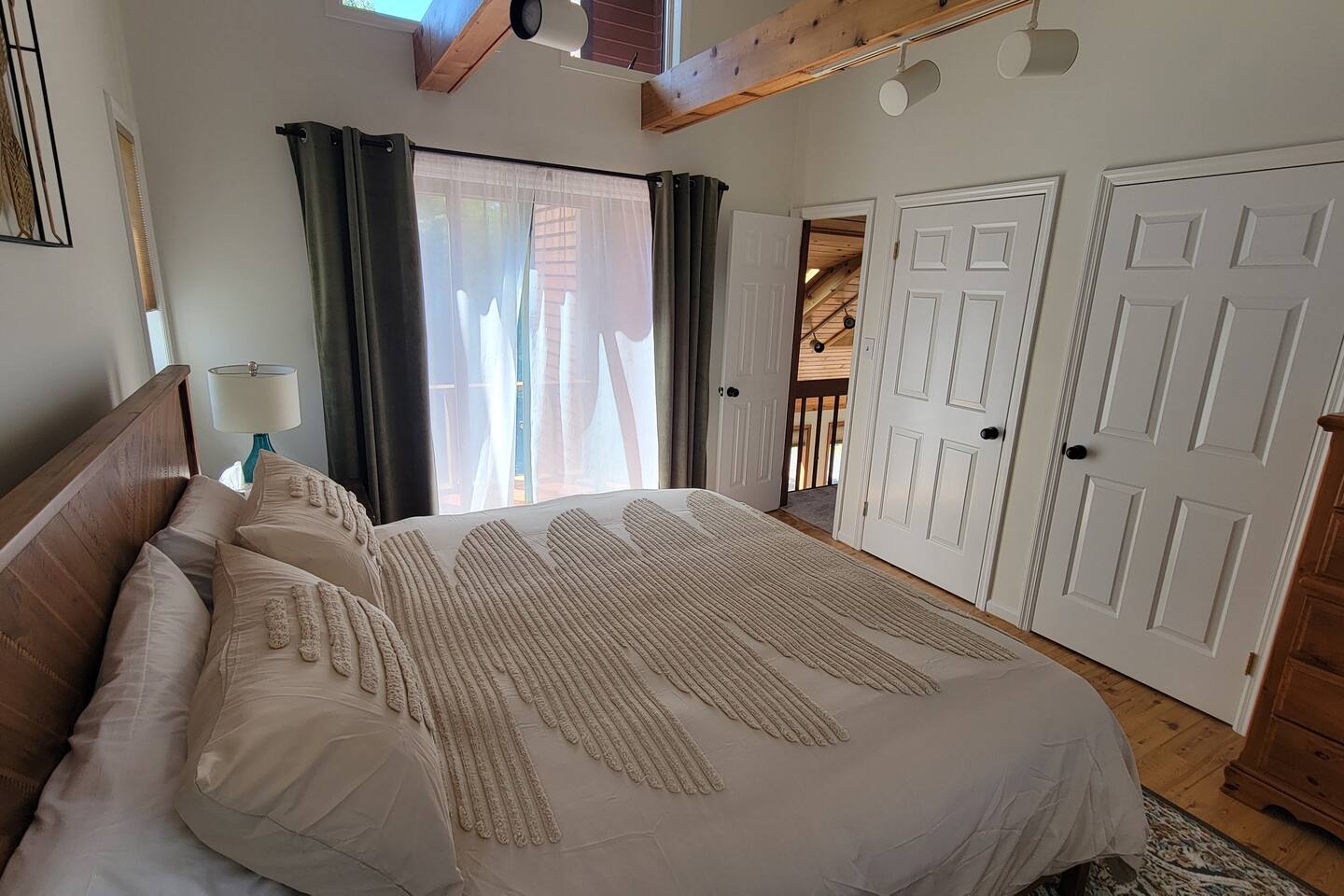 Recently renovated, we kept most of the decorative theme intact for the country home it is. It has some odd features, but we enjoyed it. The main floor is a nice-sized open space with a small full bathroom and an 8-place dining room that looks into the living room and kitchen. The living room seats 6 comfortably, and the Kitchen seats 4 at the counter. Ground Floor includes a common area with a TV, a futon that opens into a queen-sized bed, a work area with a stand-up desk, a secondary monitor, and a laptop stand. I work from home during the week when I'm in. The bedroom has a queen-sized bed and a twin bunk. A full-sized bathroom with a tub that is turned off at the moment. Also, there is a foyer with an entrance that is being renovated. This room had a garage door entrance, so we will be making this a full foyer with storage and a changing bench for the mud room. Stay tuned The second floor includes a Master Bedroom with a king-size bed, nightstands, a double-sized closet, and a private Balcony. For the romantics, it's perfect for morning coffee. The Guest room features a full size bed, dresser, and wardrobe. It's a basic but very clean room. Second floor also includes a shared full-sized bathroom and sauna. Please refrain from using the sauna while we complete an Owner's Closer separate from the upstairs. We will keep our supplies and some personal effects here for now. This is not part of the listing but will be soon.