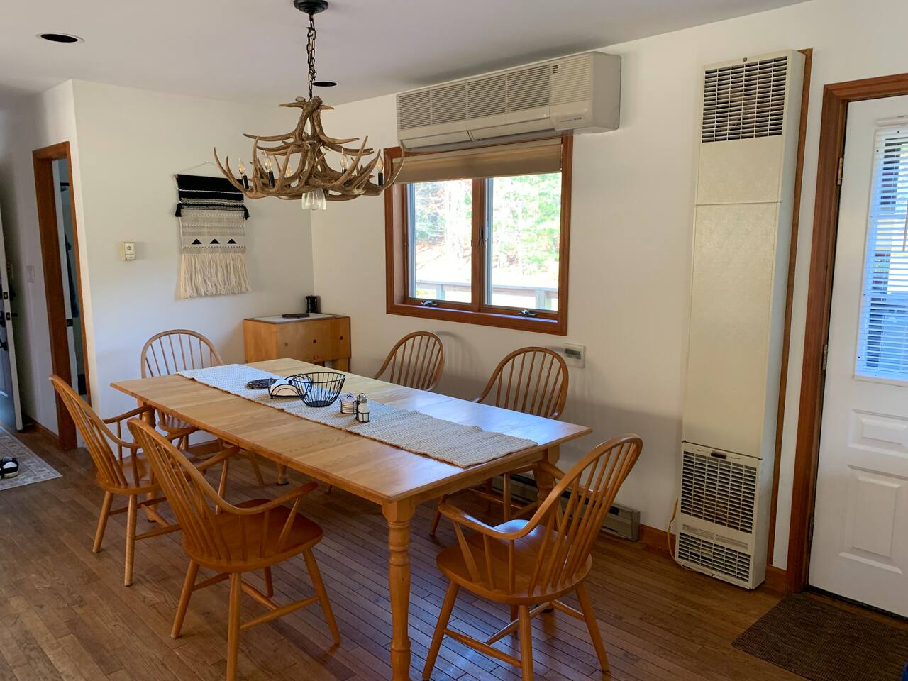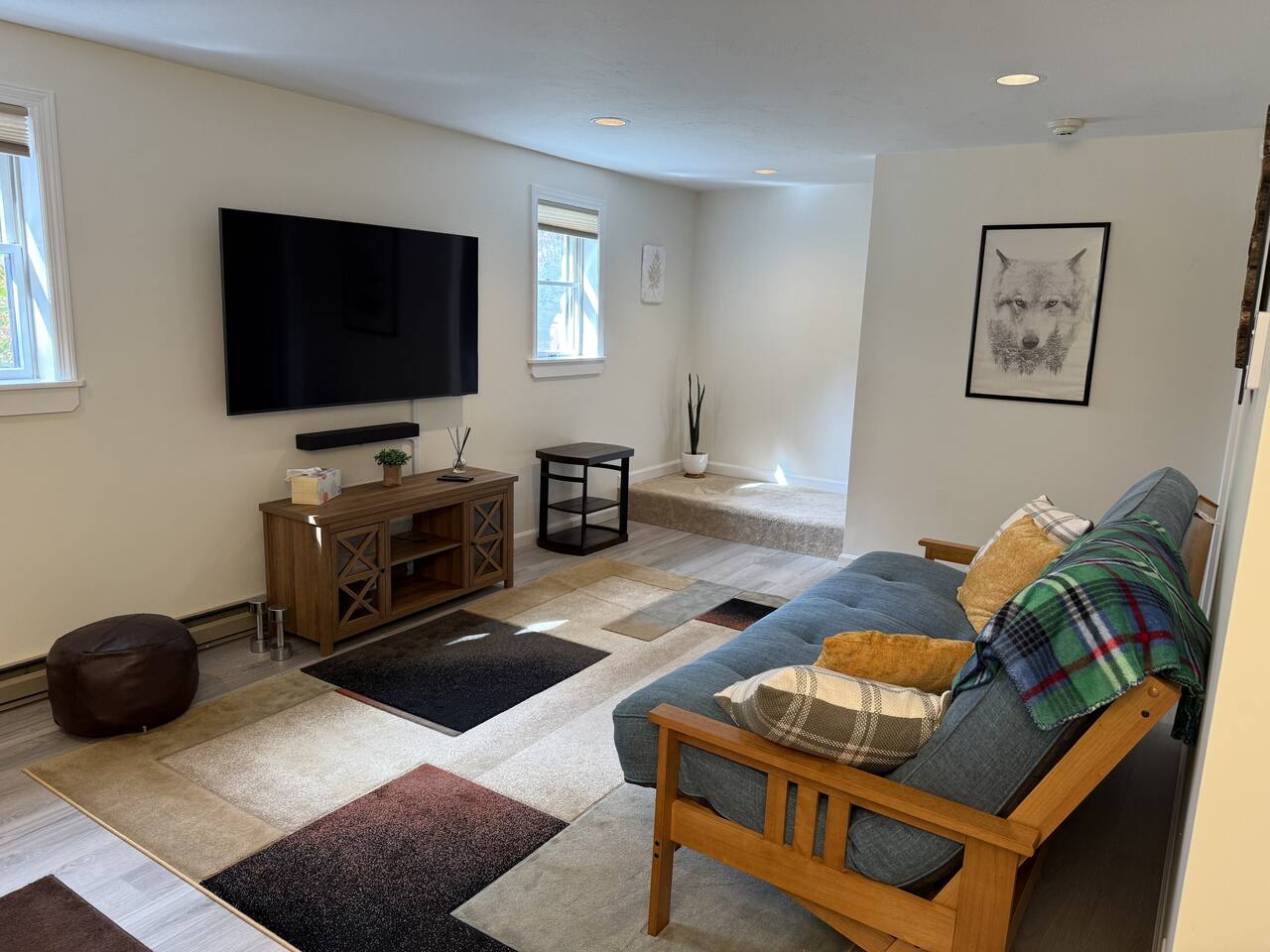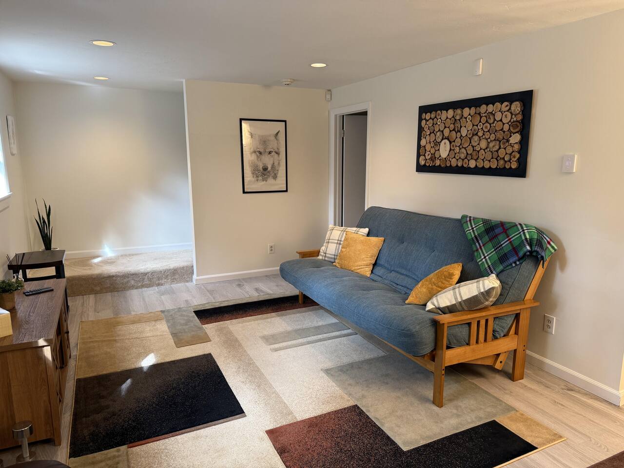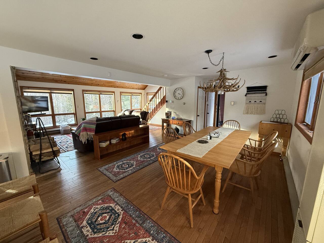 Recently renovated, we kept most of the decorative theme intact for the country home it is. It has some odd features, but we enjoyed it. The main floor is a nice-sized open space with a small full bathroom and an 8-place dining room that looks into the living room and kitchen. The living room seats 6 comfortably, and the Kitchen seats 4 at the counter. Ground Floor includes a common area with a TV, a futon that opens into a queen-sized bed, a work area with a stand-up desk, a secondary monitor, and a laptop stand. I work from home during the week when I'm in. The bedroom has a queen-sized bed and a twin bunk. A full-sized bathroom with a tub that is turned off at the moment. Also, there is a foyer with an entrance that is being renovated. This room had a garage door entrance, so we will be making this a full foyer with storage and a changing bench for the mud room. Stay tuned The second floor includes a Master Bedroom with a king-size bed, nightstands, a double-sized closet, and a private Balcony. For the romantics, it's perfect for morning coffee. The Guest room features a full size bed, dresser, and wardrobe. It's a basic but very clean room. Second floor also includes a shared full-sized bathroom and sauna. Please refrain from using the sauna while we complete an Owner's Closer separate from the upstairs. We will keep our supplies and some personal effects here for now. This is not part of the listing but will be soon.